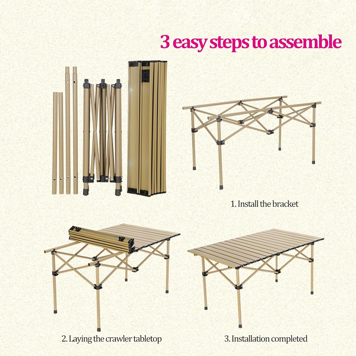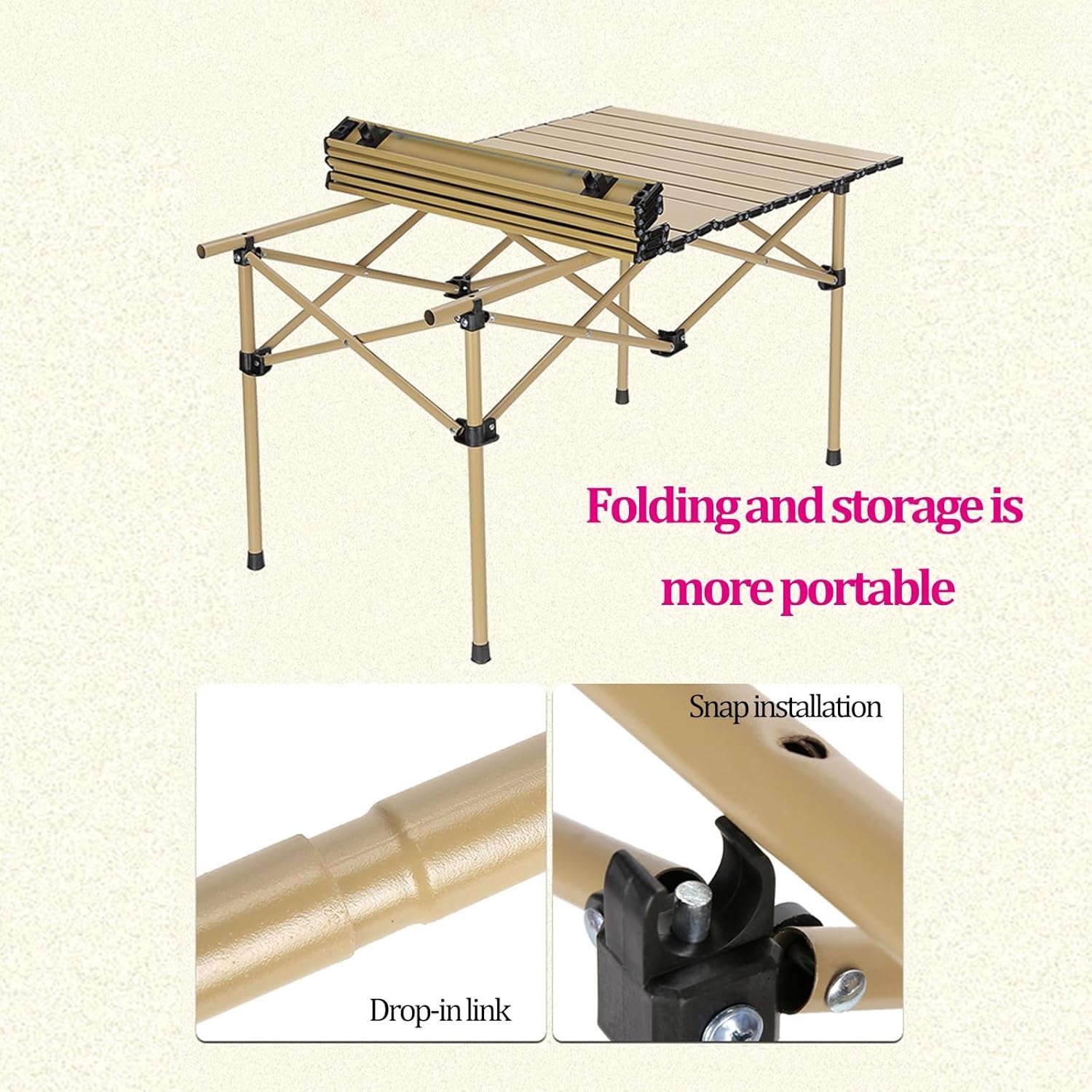 Fabricată din aluminiu rezistent și având o culoare elegantă bej, această masă oferă o combinație perfectă între funcționalitate, portabilitate și durabilitate.